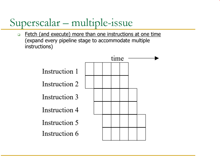 그래서 나온게 Superscalar 그냥 hw늘려서 명령어 여러개 가져와서 같이하자는 거임. 언듯보면 멀티프로세싱이랑 비슷해보이지만 다르다. 멀티 프로세서는 각 프로세서마다 각자의 PC를 갖고있는 반면 superscalar는 결국 같은 프로세스 이므로 같이 진행한다.