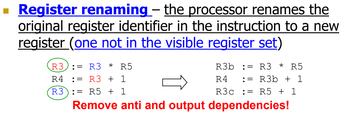 근데 나머지 anti와 output dependency인 경우 Register renaming을 통해서 해결 가능하다. 따라서 순서 바꾸기 가능.