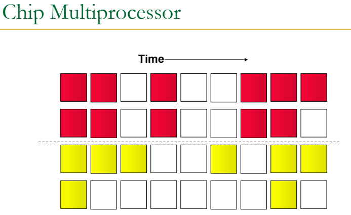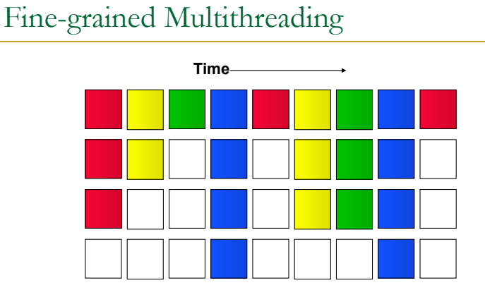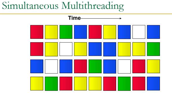 + 만약 첫번째 clock에서 파란색이 branch라고 하자. 그럼 다음 clock부터 파란색 thread의 instruction을 적게 가져오는 방법을 쓴다던지 높은 priorty thread가 있다면 먼저 다 채워준다는 등의 여러 policy로 전체 성능과 single thread 성능을 둘다 컨트롤 할 수 있다.