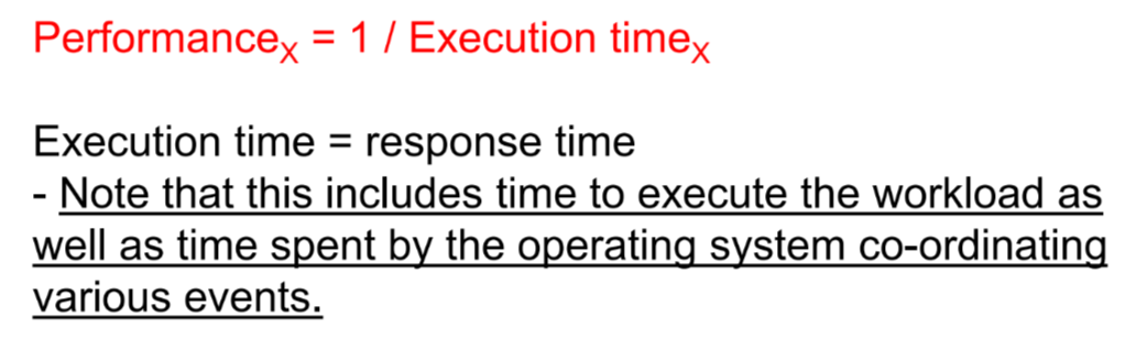 - Response time (Latency) : time elapsed betwwen start and end of a program, 새로운 일이 주어지면 반응하는 시시간, 응답시간 // 엄밀히 따지면 response time과 latency를 구분하는데 비슷한 개념