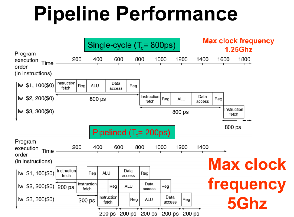 single인 경우에는 한 clock에 모든 일을 처리하고 다음 clock때 Write하는 방법이었는데 pipeline인 경우 clock이 짧아져서 성능이 좋다.