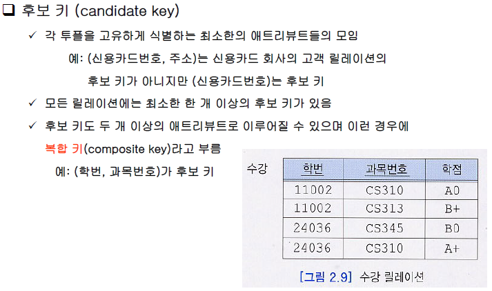 모든 릴레이션에 최소 한 개 이상의 후보 키가 있다. 왜냐? 릴레이션의 튜플들에 집합이기 때문에 중복을 허용하지 않느다. 따라서 튜플들을 구별해주는 후보 키가 존재한다.