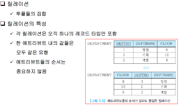 투플 순서 노상관. 위 두개는 동일한 릴레이션