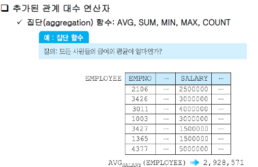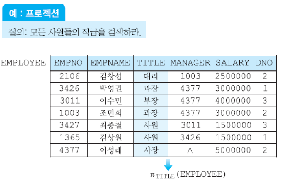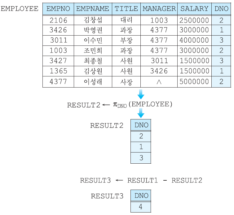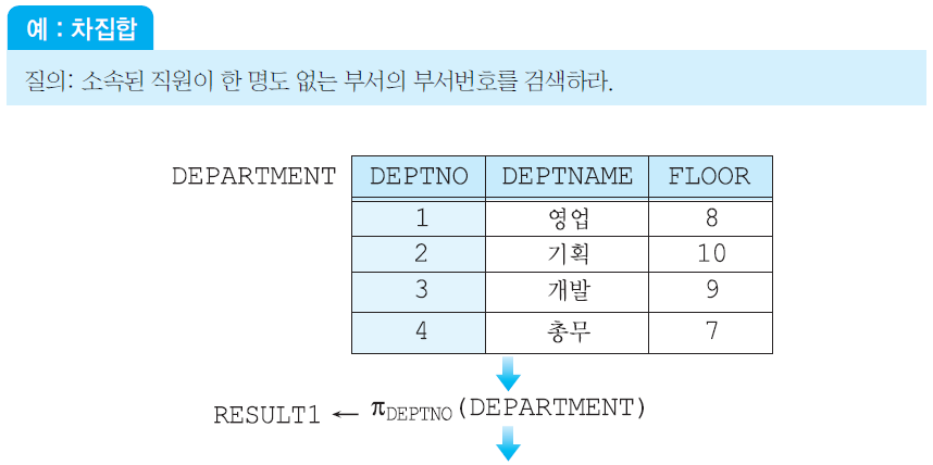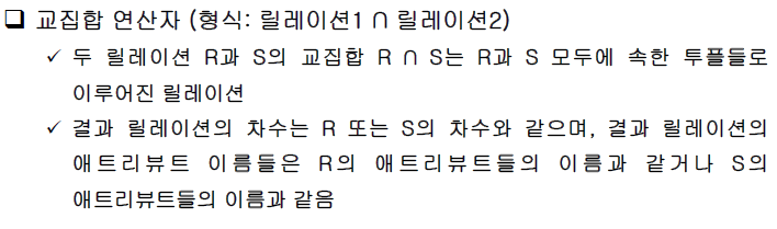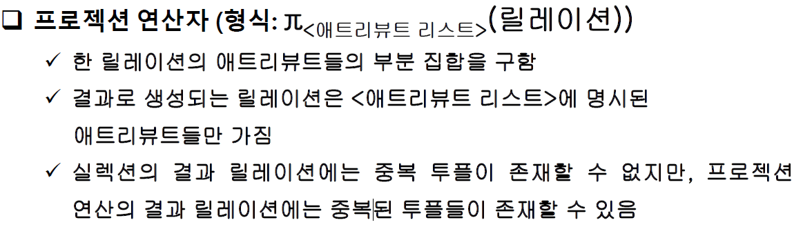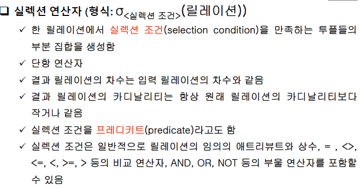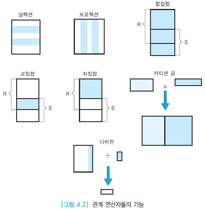 실렉션, 프로젝션, 합집합, 차집합, 카디션 곱은 관계 대수의 필수적인 연산자