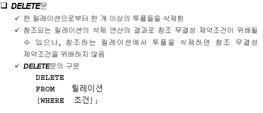 삭제 where에 아무것도 안쓰면 튜플 전체 삭제 릴레이션 삭제하고싶으면 drop쓰셈