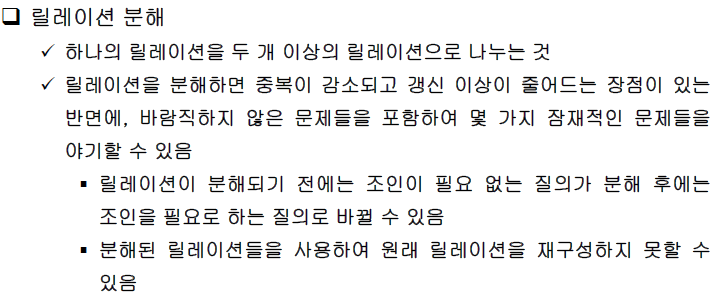 나쁜 분해한다음 자연조인하면 원래 릴레이션에는 없었던 가짜 투플이 생길 수 있다.