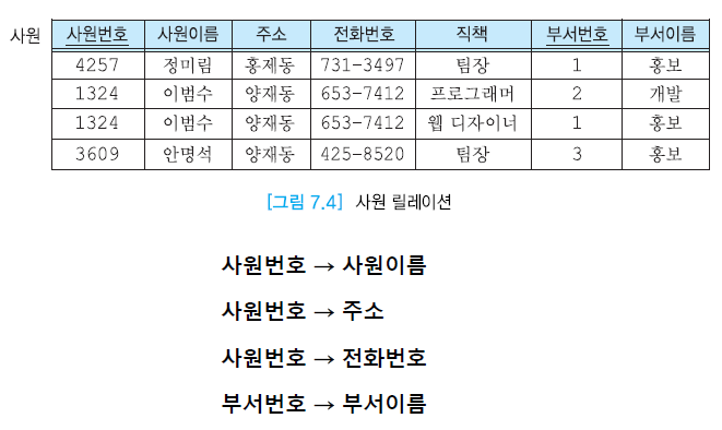 하지만 이런 방법도 정보의 중복(부서말고 다 중복됨) 저장공간 낭비, 수정 이상(만약 부서이름이 바꼈을 때 모든 튜플의 부서이름 변경해야된다.)