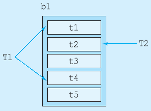 T1 과 T2가 위 상황인 경우 만약 로크 단위가 튜플인경우 각 튜플에 로크 걸고 두개의 트랜잭션이 동시에 수행가능