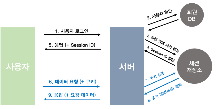 계정정보를 header에 넣어서 각 요청마다 인증하거나 session과 cookie 둘다사용해야됨.