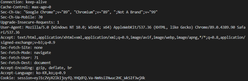 request를 찍어보면 cookie에 session에대한 정보가 담긴걸 볼 수 있다. 이걸로 session 구분하는거임 ㅇㅇ