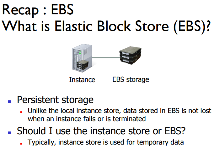 disk를 가상화한게 EBS instance란 분리되어있어서 life cycle이 다름 ec2가 꺼져도 독립적으로 사용 가능.