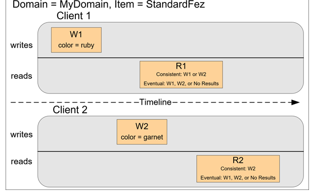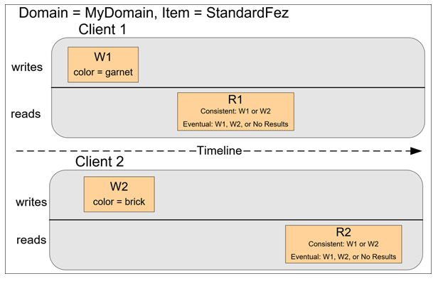 위와 같은 상황에서 consistency 보장되면 R1 R2 모두 W2가 보여줘야되지만 Eventual에서는 W1,W2 no result 장담 못한다.