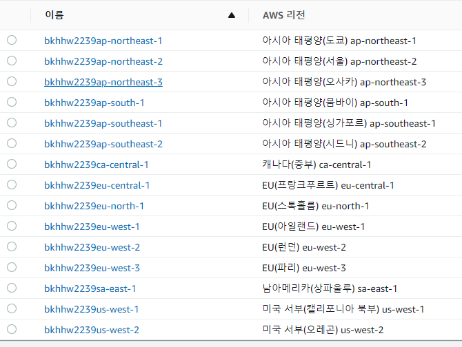 리전이 상황에 따라서 되는곳도 안되는곳도있어서 해보면서 안되는건 뺐다.